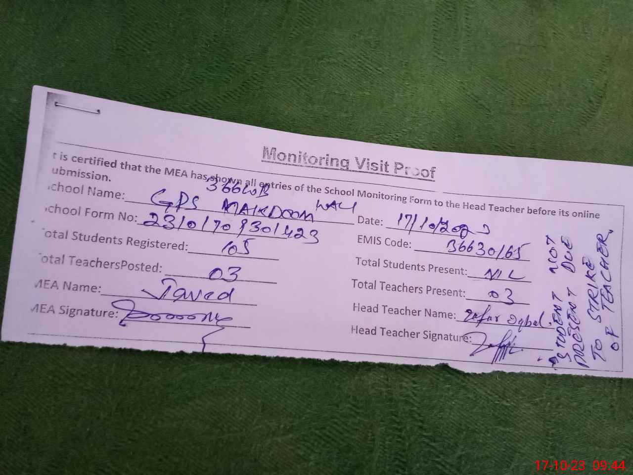 | Attendance Register | Head Teacher | MEA with School | Visit Proof |