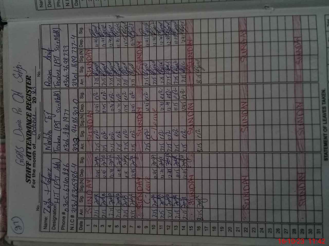 | CNIC | Full Name | Designation | R/C | Absence During Last Calender Month |