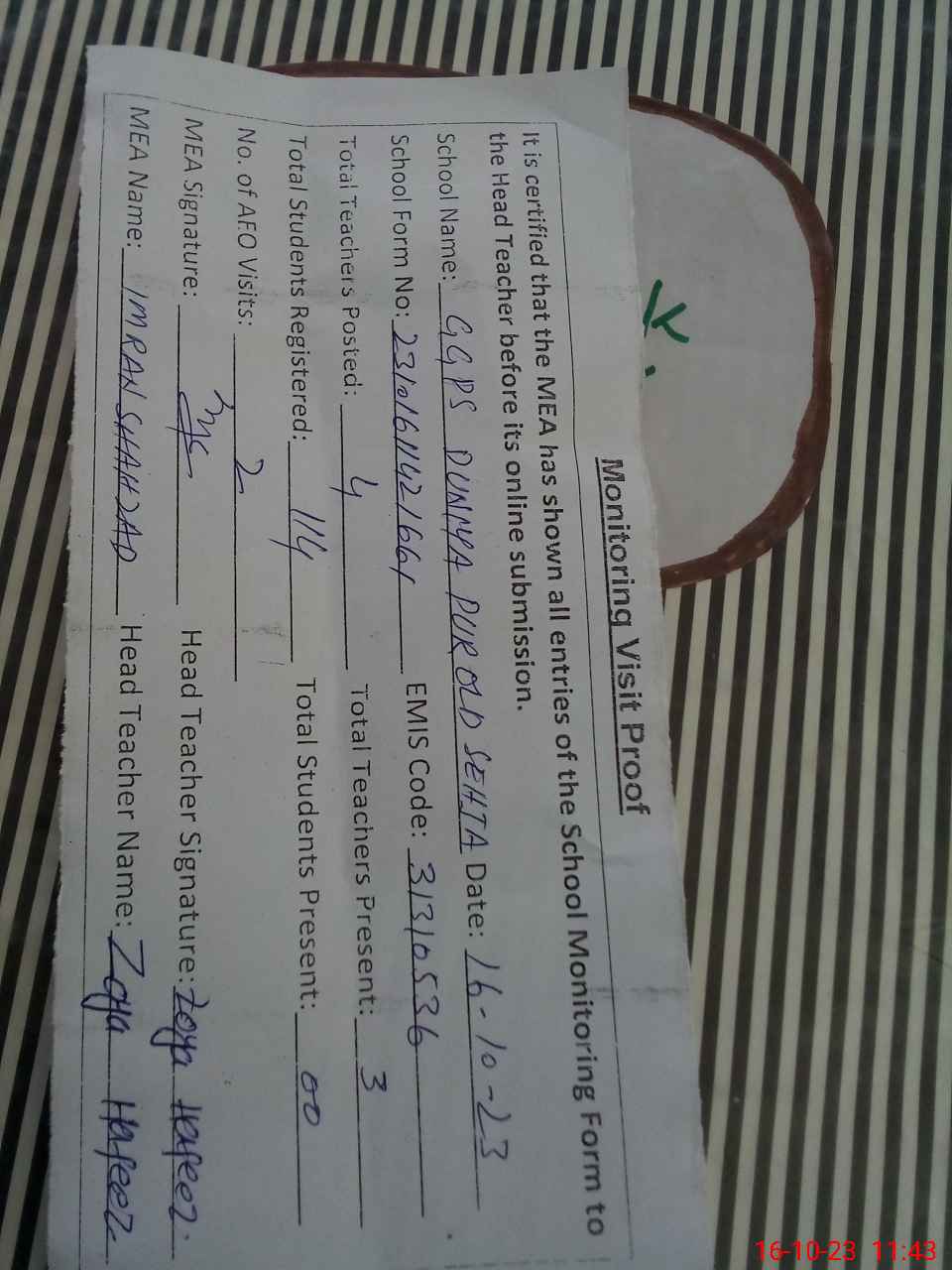| Attendance Register | Head Teacher | MEA with School | Visit Proof |