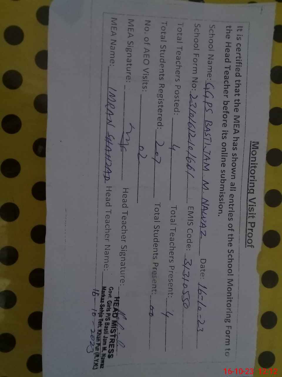 | Certified that this School was Inspected by the Undersigned MEA/DMO Today and the Information Stated Above is as Per Record. | |||||