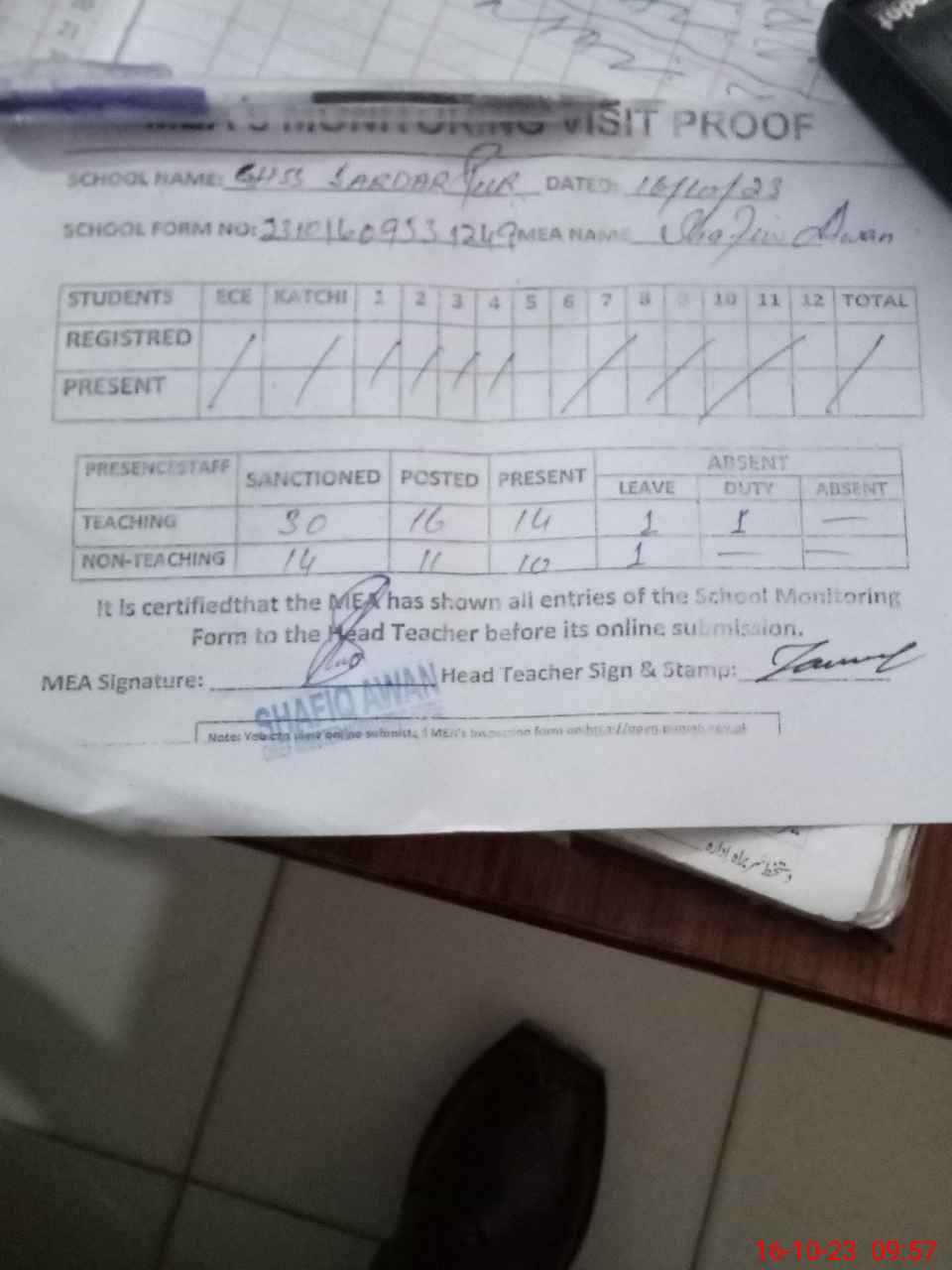 | Attendance Register | Head Teacher | MEA with School | Visit Proof |