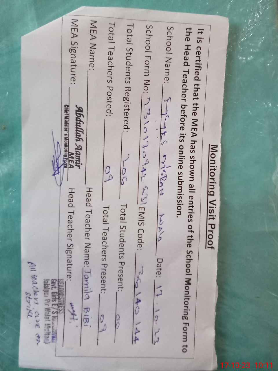 | Remarks (Use Separate Page if Required): Note All Teachers are present in school but they are on strike with wearing black ribion on arm Three Class lnd not taken due to Absent of stufents | |||||