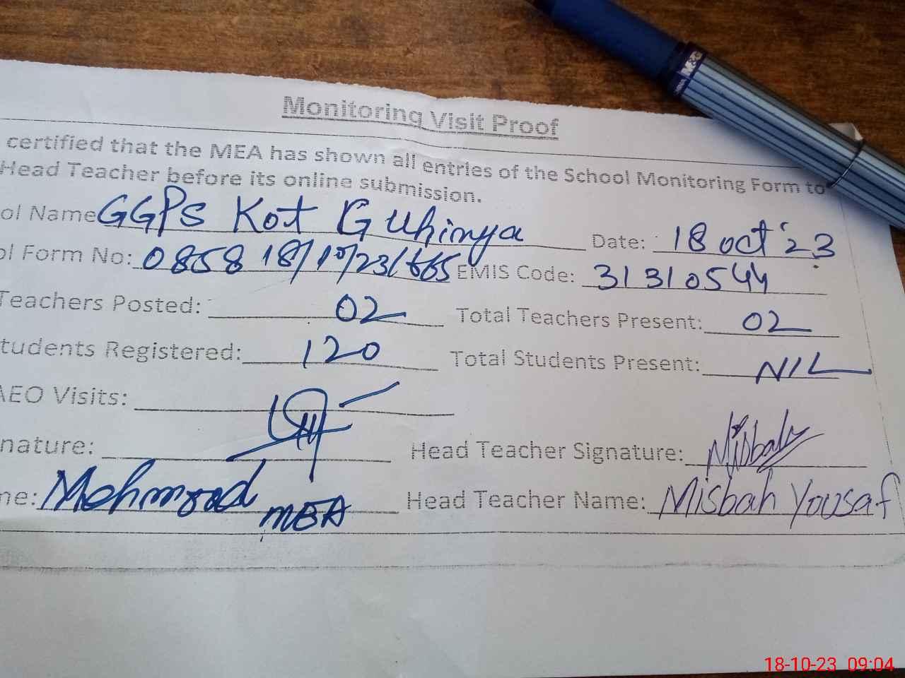 | Attendance Register | Head Teacher | MEA with School | Visit Proof |