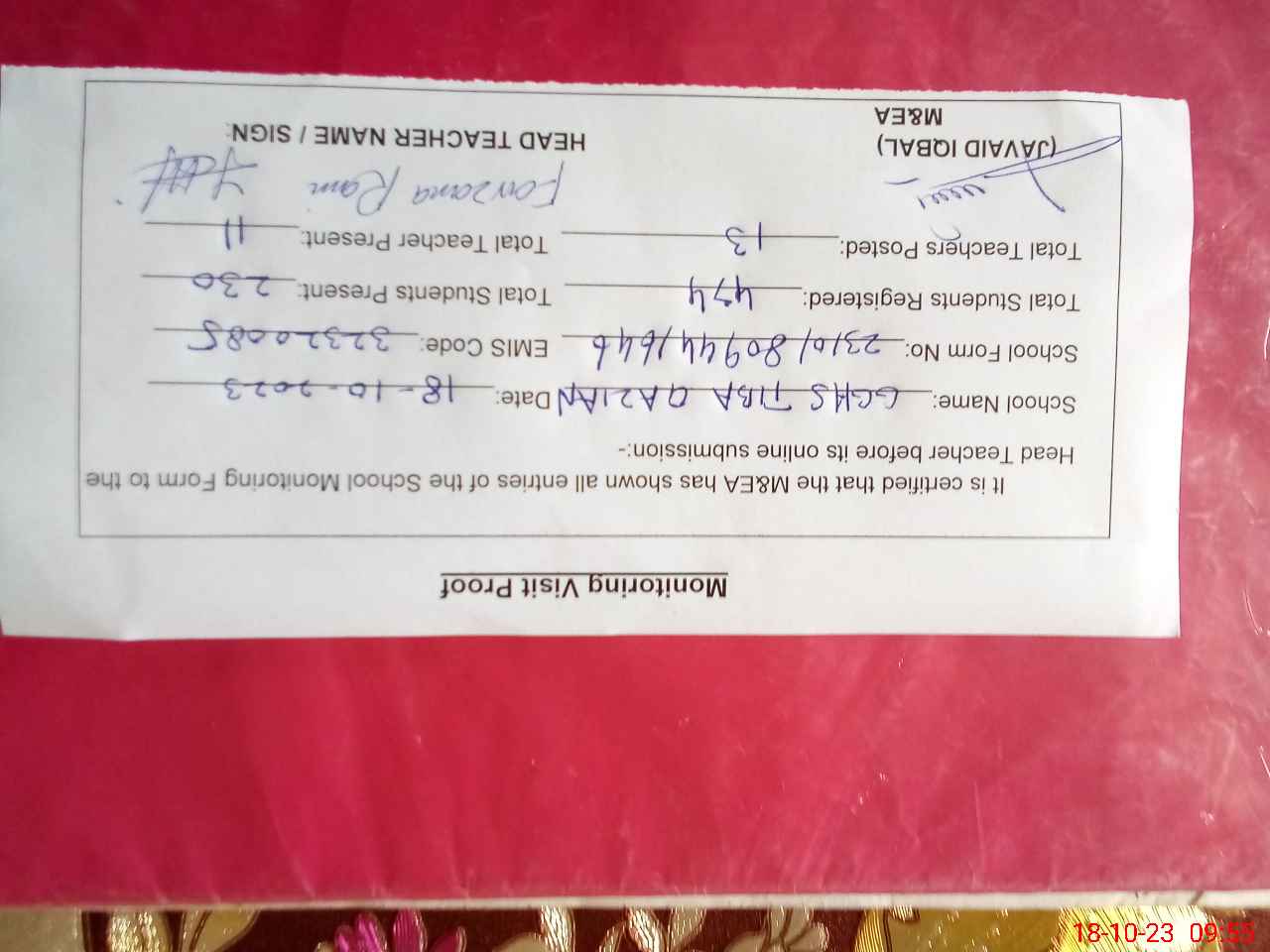 | Certified that this School was Inspected by the Undersigned MEA/DMO Today and the Information Stated Above is as Per Record. | |||||