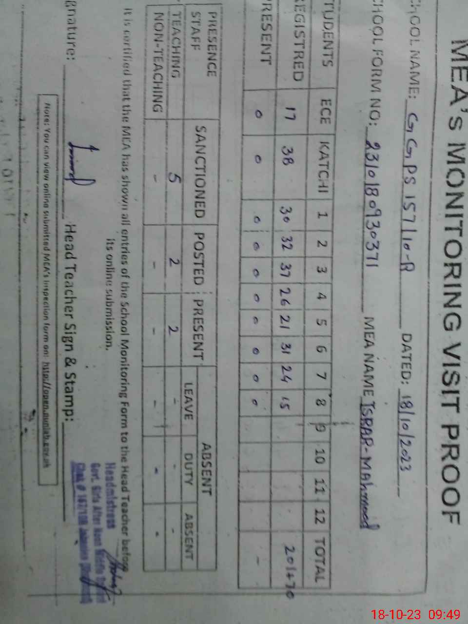 | Attendance Register | Head Teacher | MEA with School | Visit Proof |