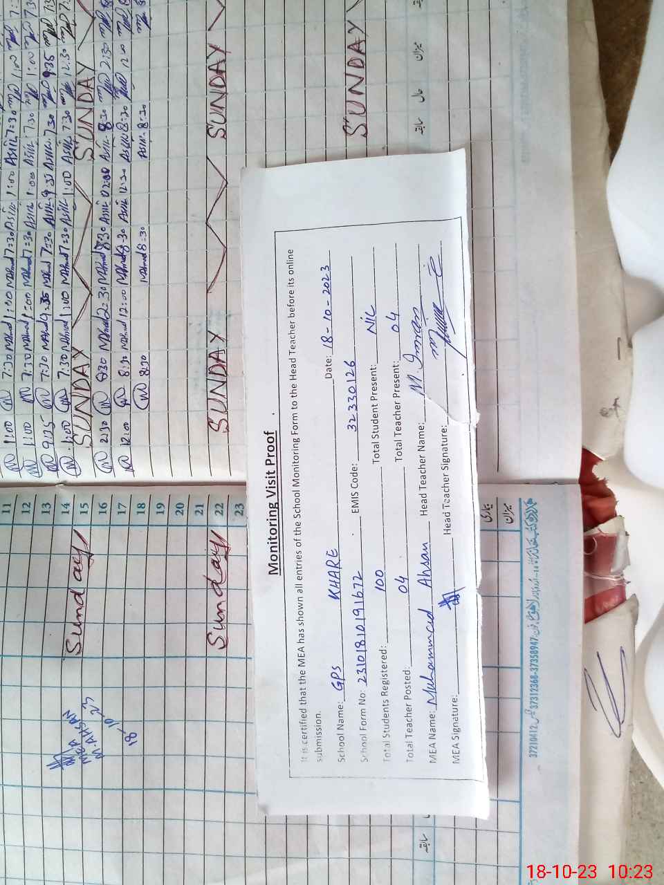 | Attendance Register | Head Teacher | MEA with School | Visit Proof |