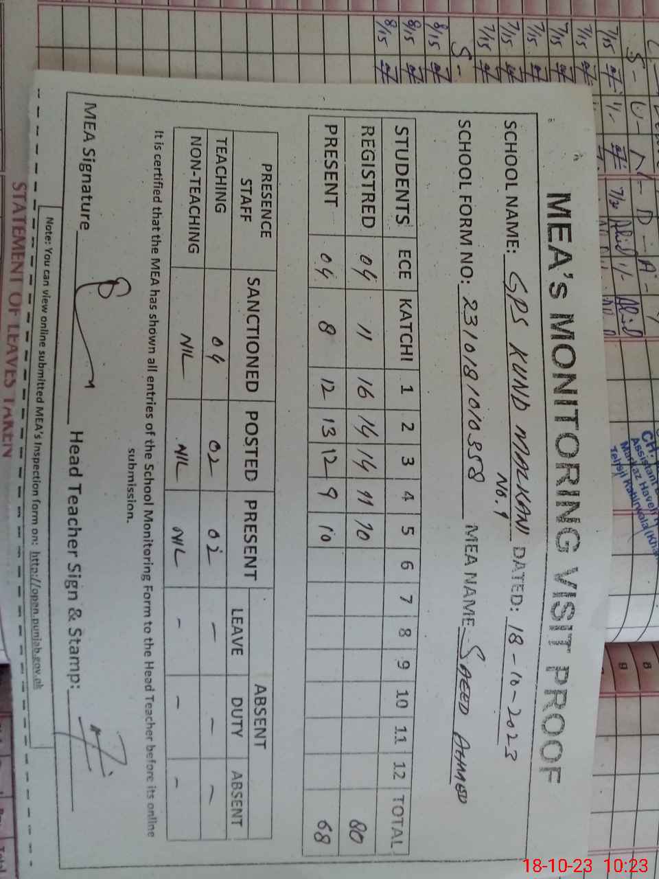 | EMIS Code: 36410218 | Name of School: GPS KUND MALKANI NO.1 SARAI SIDHU | |||