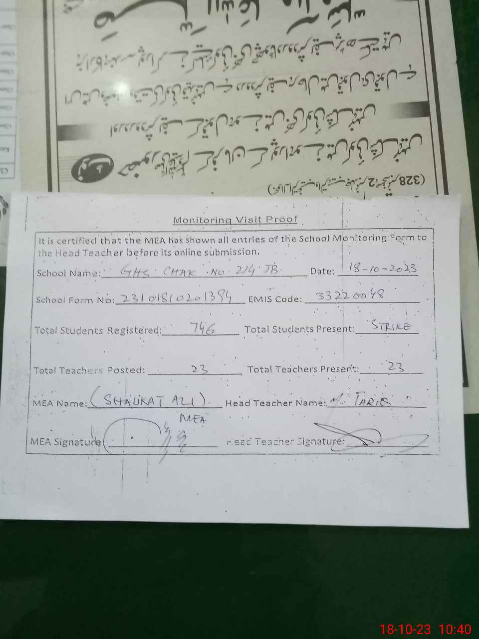 | Attendance Register | Head Teacher | MEA with School | Visit Proof |