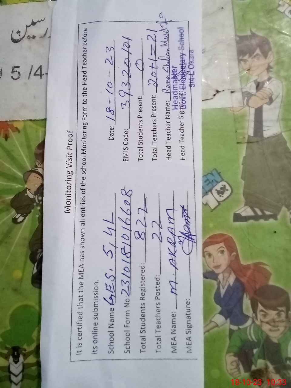 | Attendance Register | Head Teacher | MEA with School | Visit Proof |