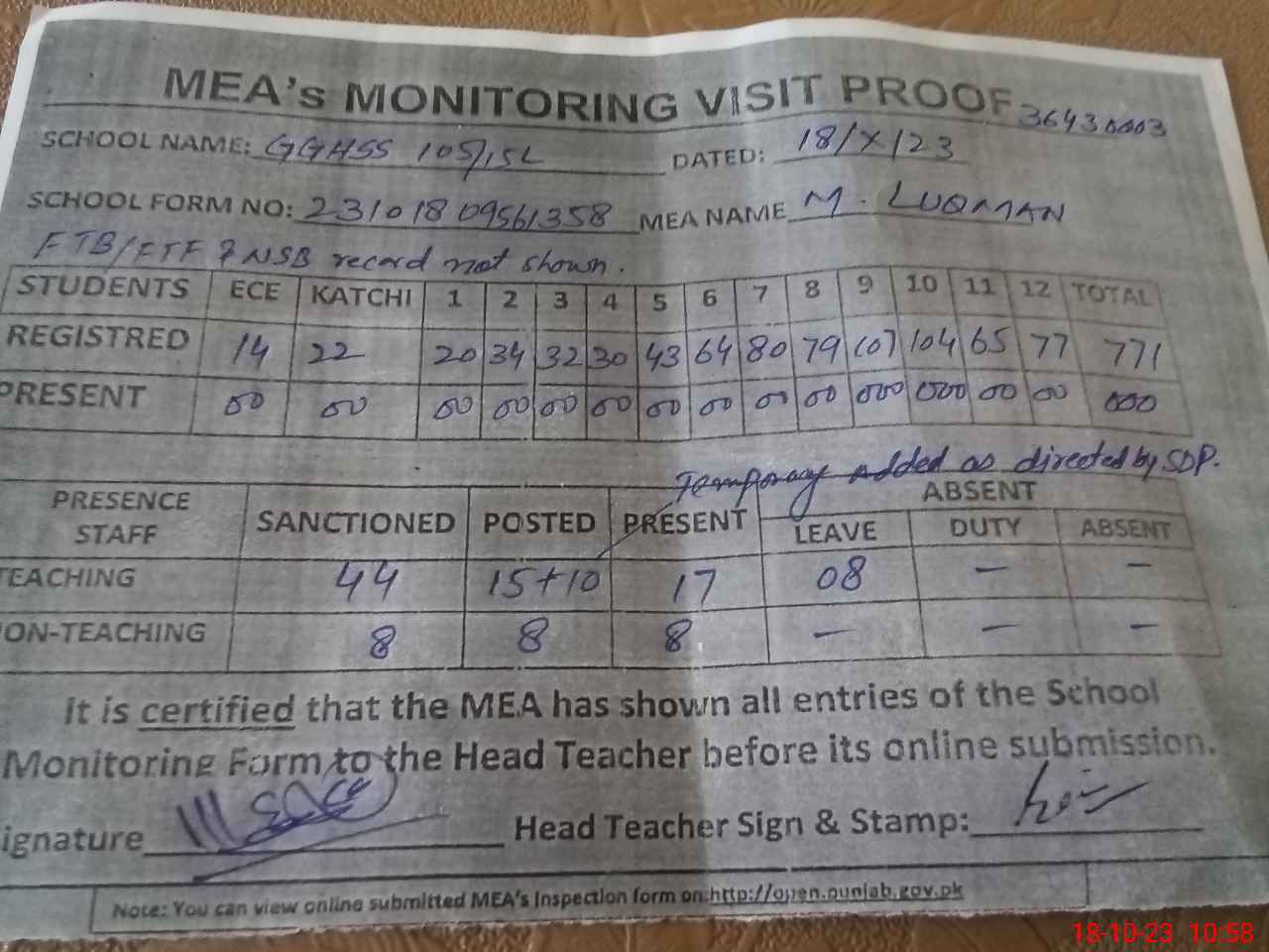 | Remarks (Use Separate Page if Required): FTB FTF and NSB records not shown Teachers and non teachers staf was present but students were not present GGCMS merged into this school but concerned teaching staff yet not added in PMIU teachers list however their names are added as temporary staff | |||||