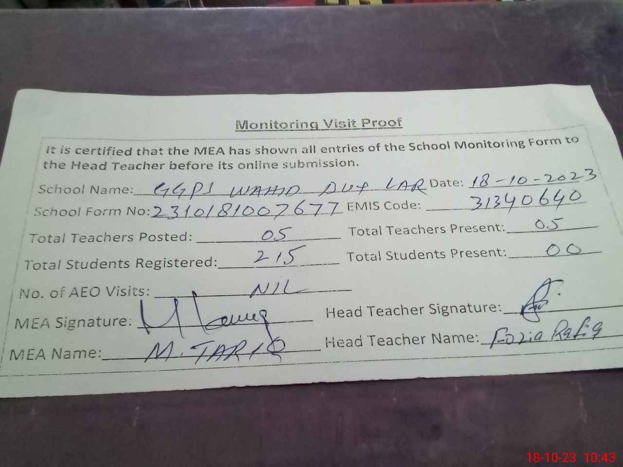 | EMIS Code: 31340640 | Name of School: GGPS WIHID BUX LAR | |||