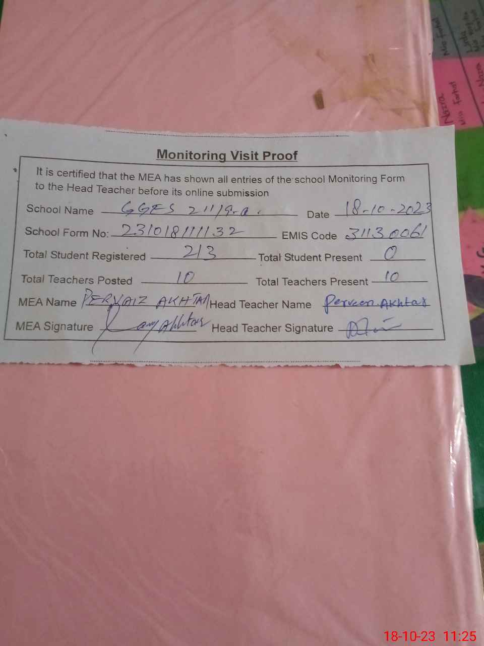 | Attendance Register | Head Teacher | MEA with School | Visit Proof |