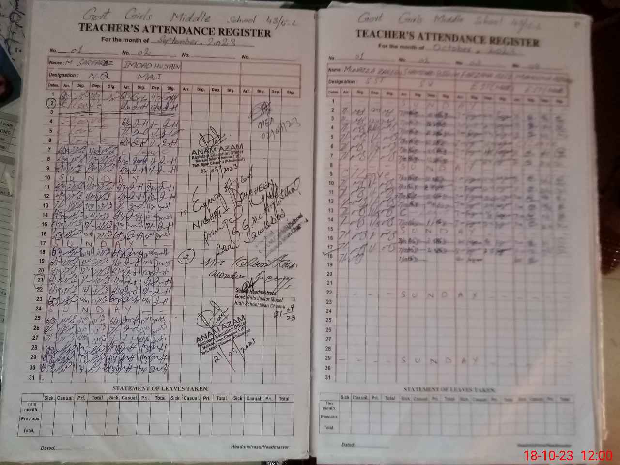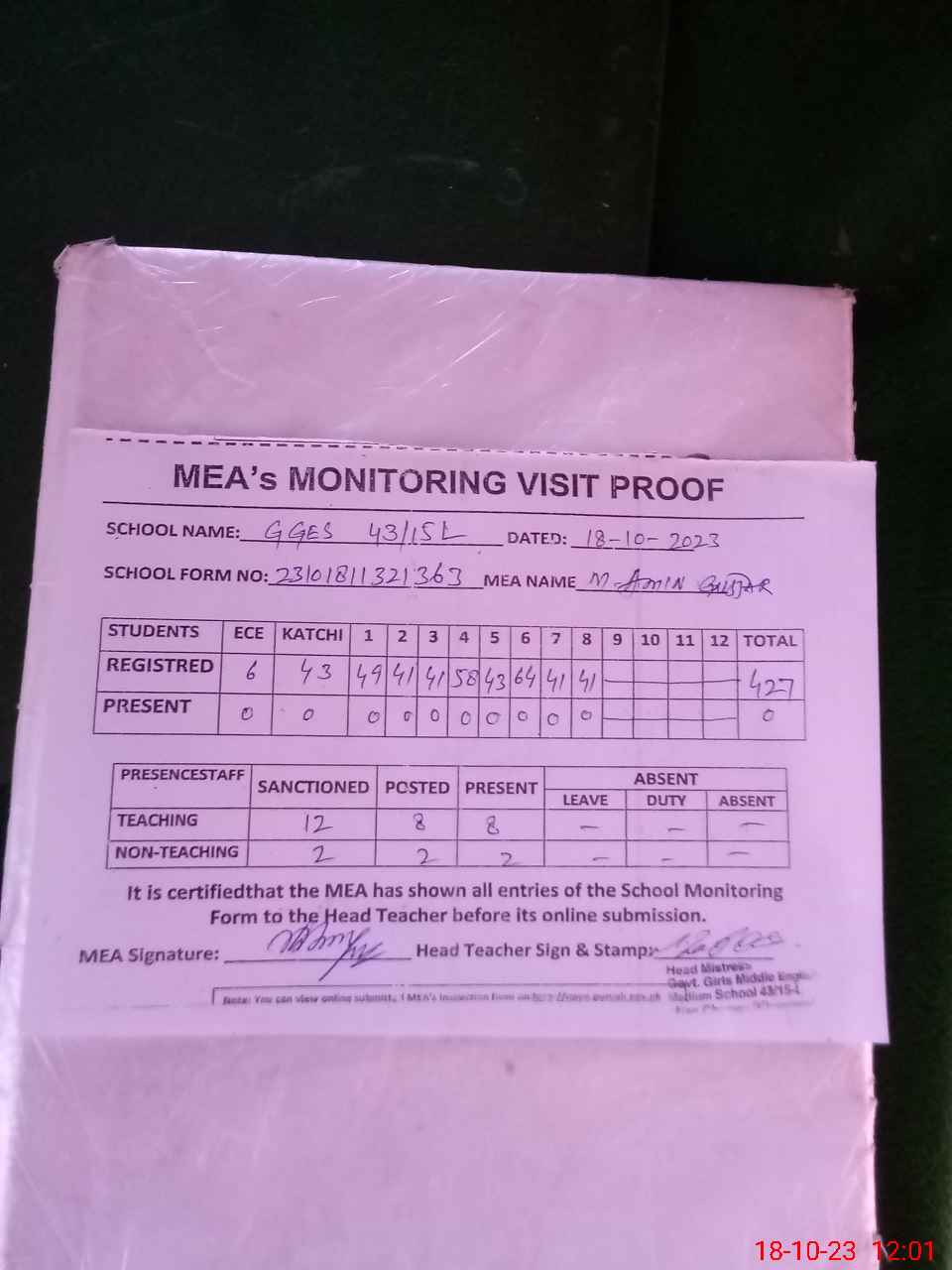 | Attendance Register | Head Teacher | MEA with School | Visit Proof |