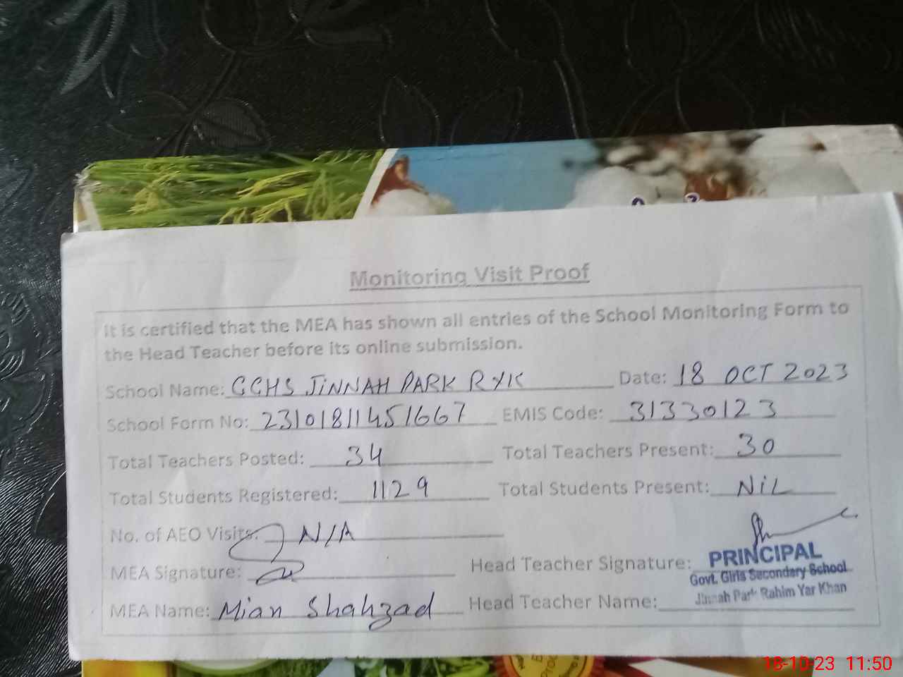 | EMIS Code: 31330123 | Name of School: GGHS JINNAH PARK R.Y. KHAN | |||