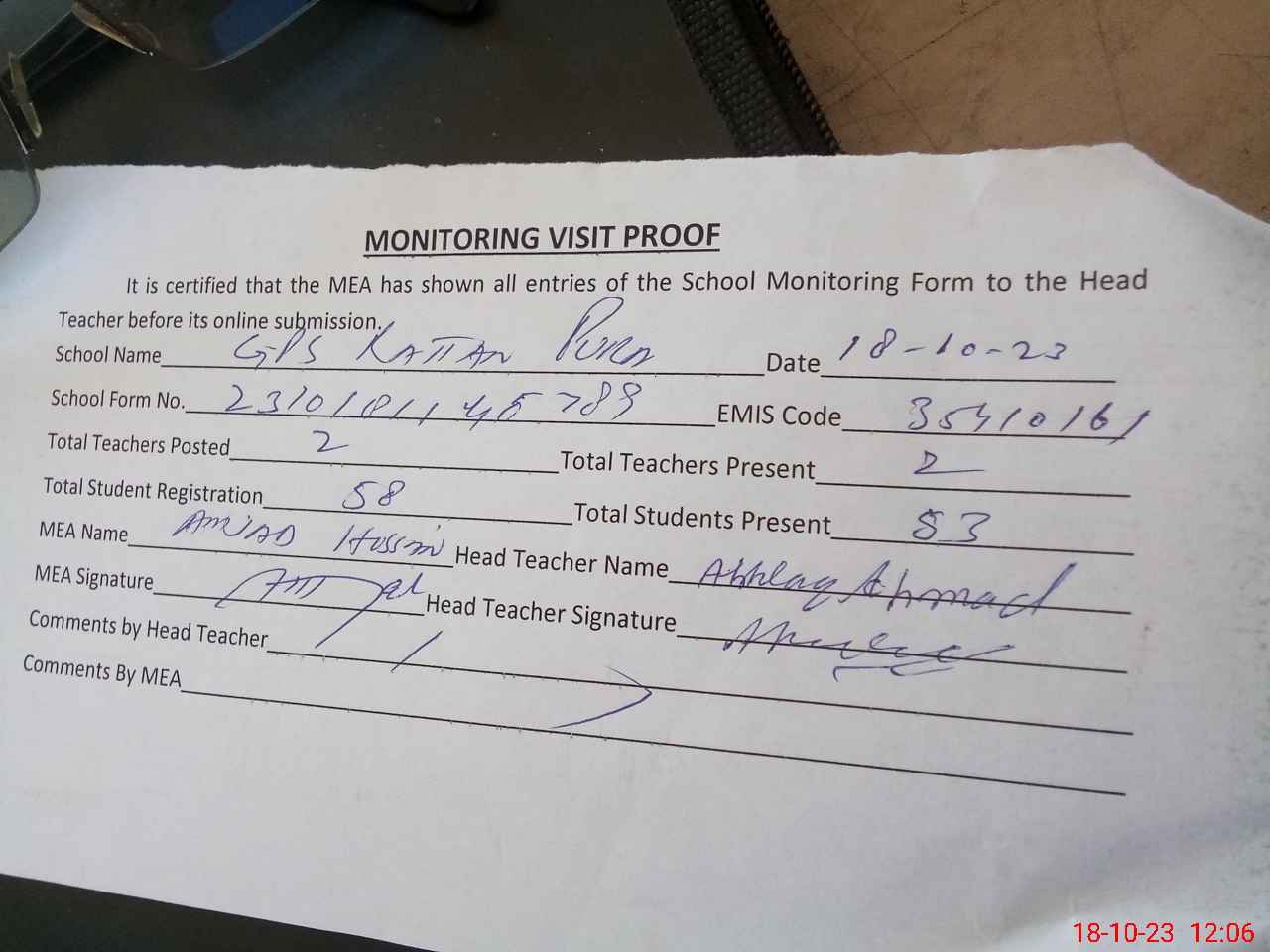 | Attendance Register | Head Teacher | MEA with School | Visit Proof |