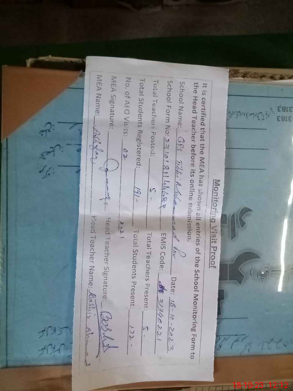 | Attendance Register | Head Teacher | MEA with School | Visit Proof |