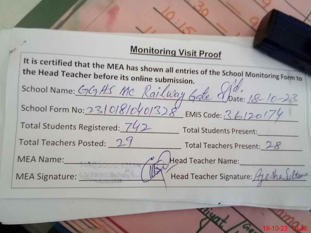 | EMIS Code: 36120174 | Name of School: GGHS MC RAILWAY GATE SHUJABAD | |||