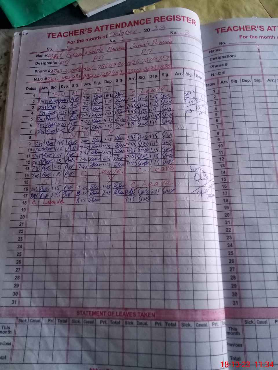 | Name: RI**** PE**** Designation: (School Headmaster's/Headmistress's) PST Phone/Cell Number: 03**** |