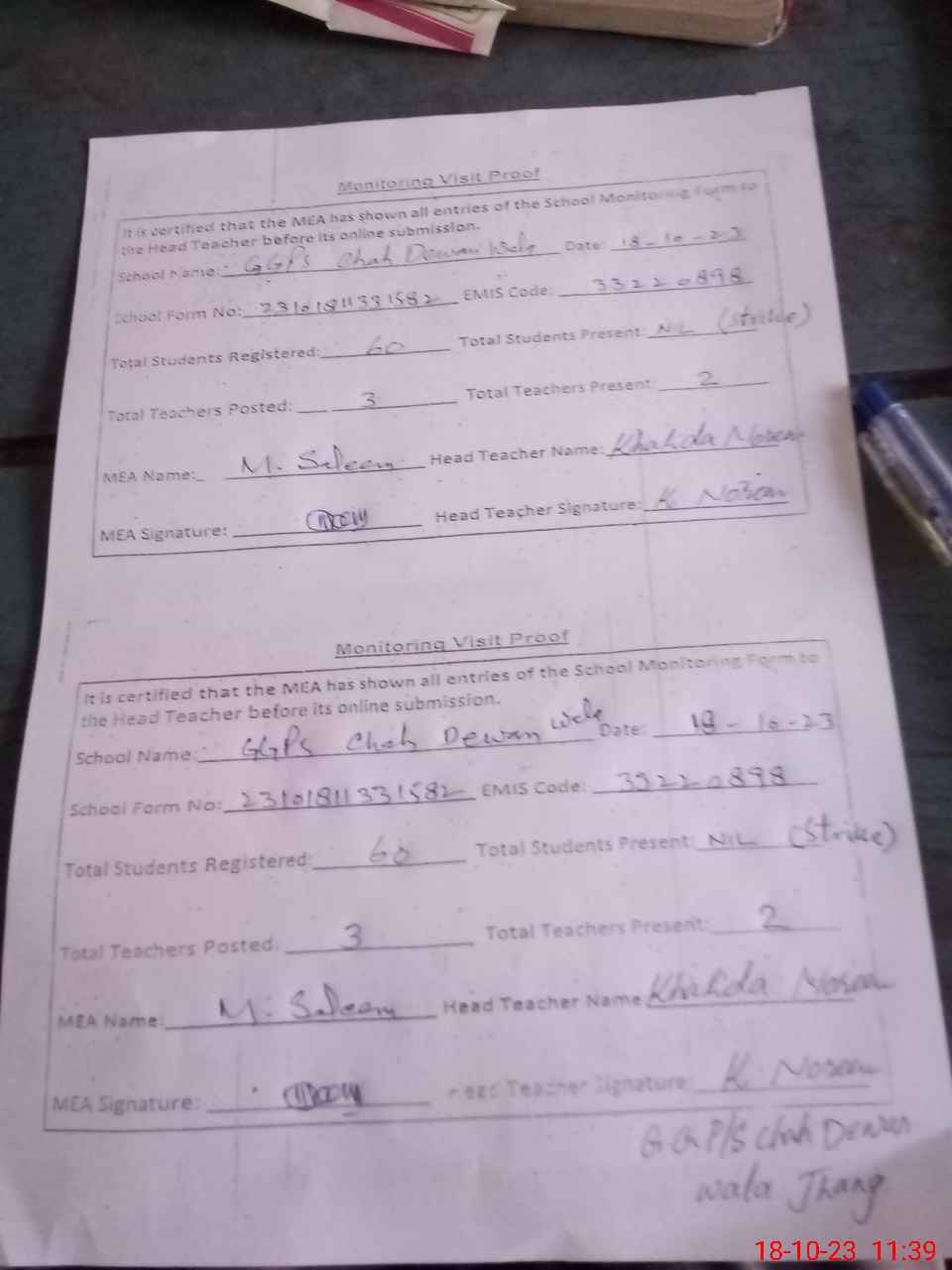 | Attendance Register | Head Teacher | MEA with School | Visit Proof |