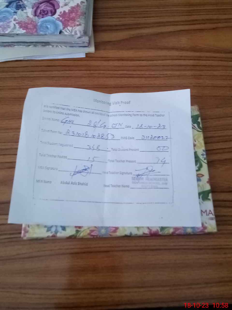 | Attendance Register | Head Teacher | MEA with School | Visit Proof |