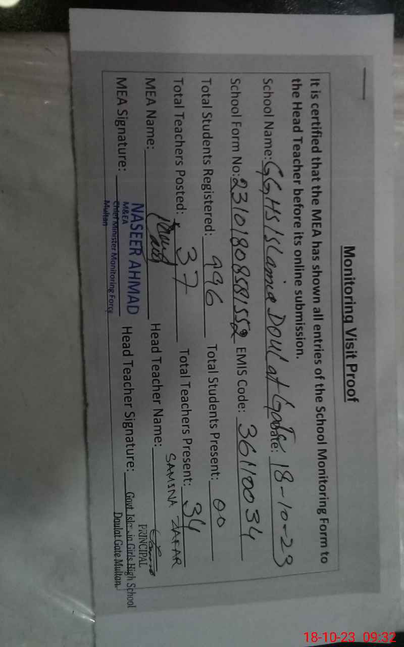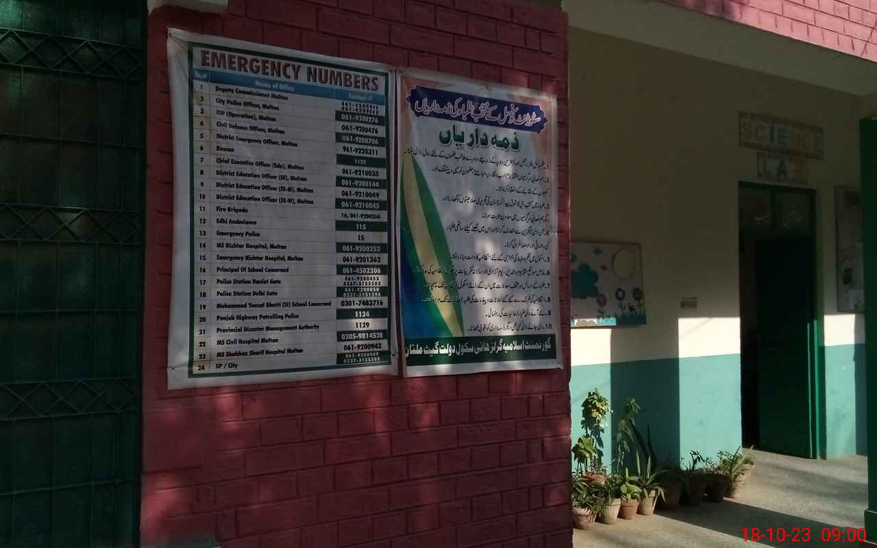 | EMIS Code: 36110034 | Name of School: GGHS ISLAMIA DOULAT GATE MULTAN | |||