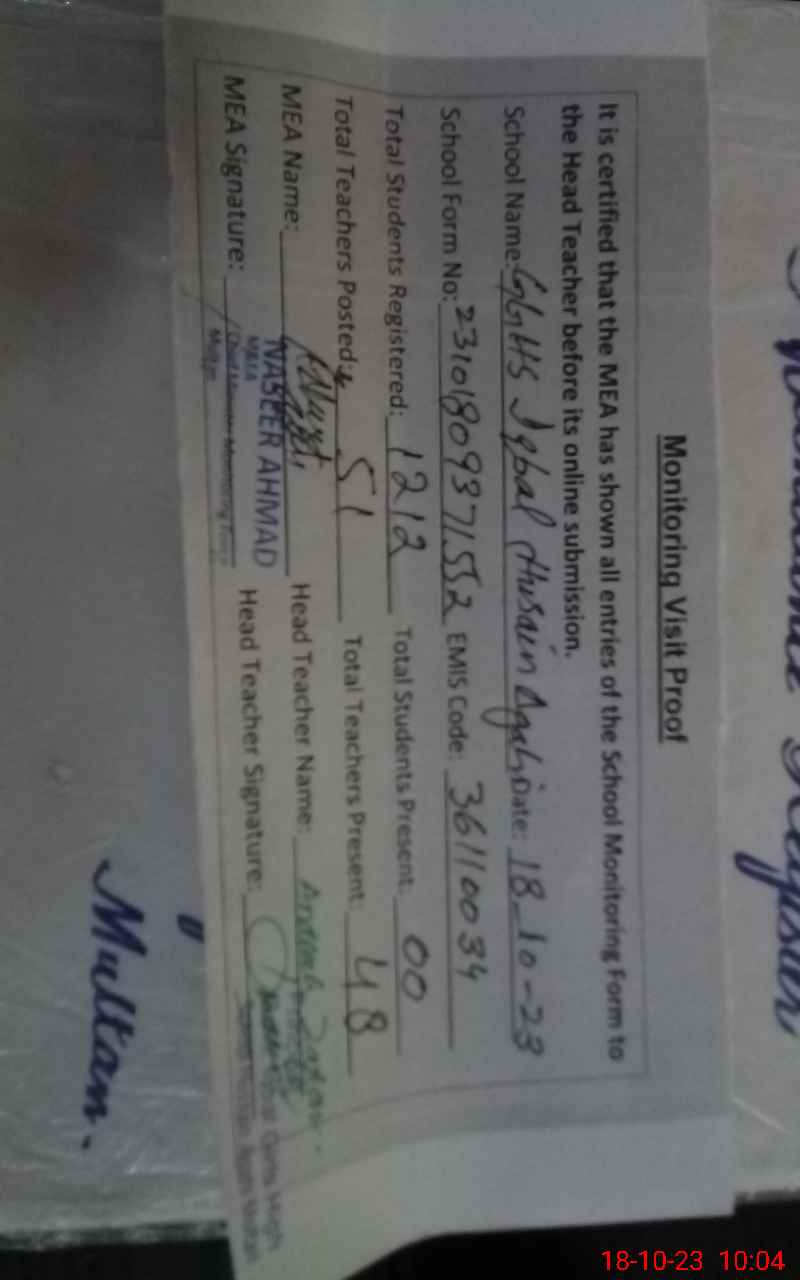 | EMIS Code: 36110032 | Name of School: GGHS IQBAL HUSSAIN AGAHI ROAD MULTAN | |||