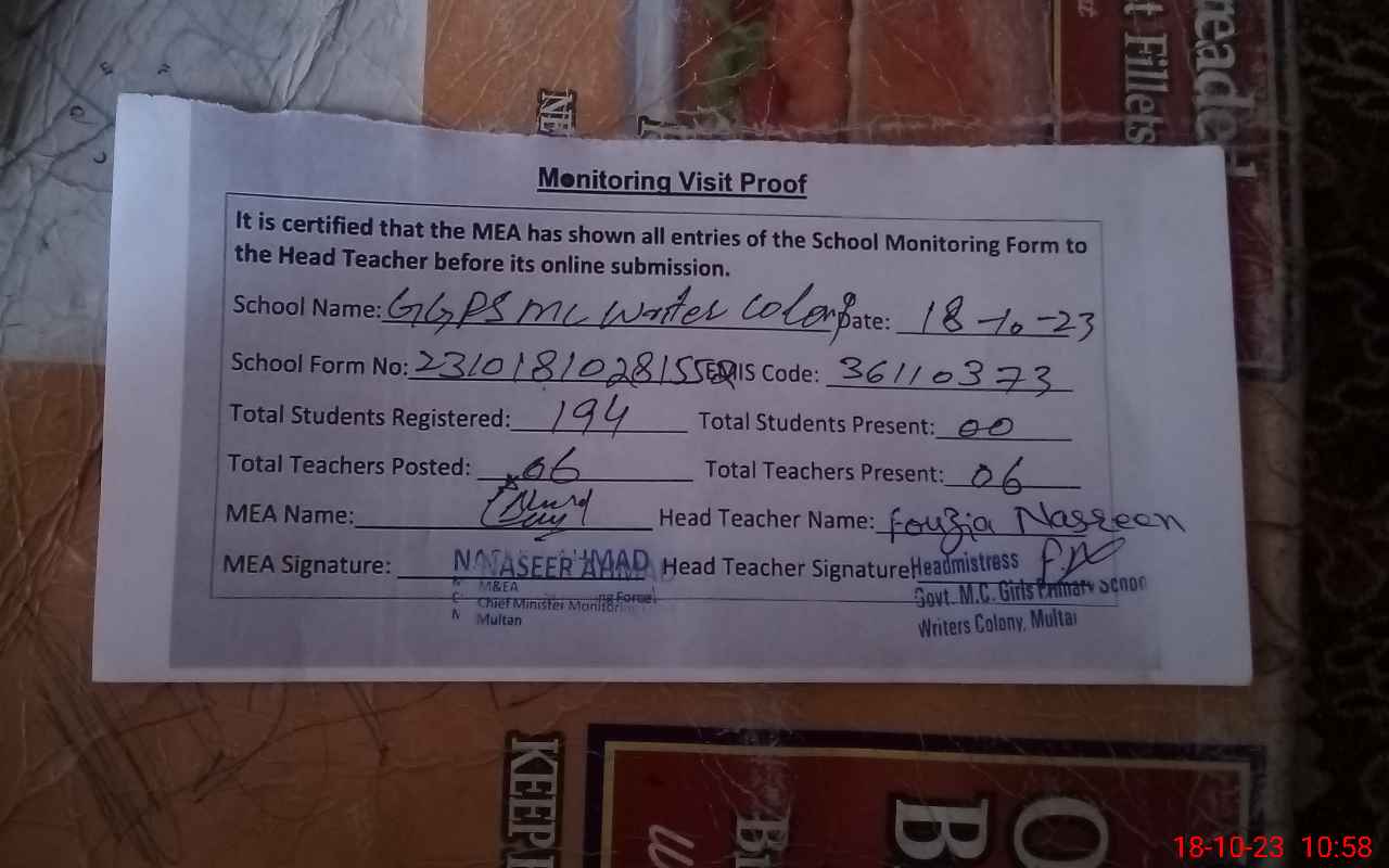 | EMIS Code: 36110373 | Name of School: GGPS MC WRITERS COLONY MULTAN | |||