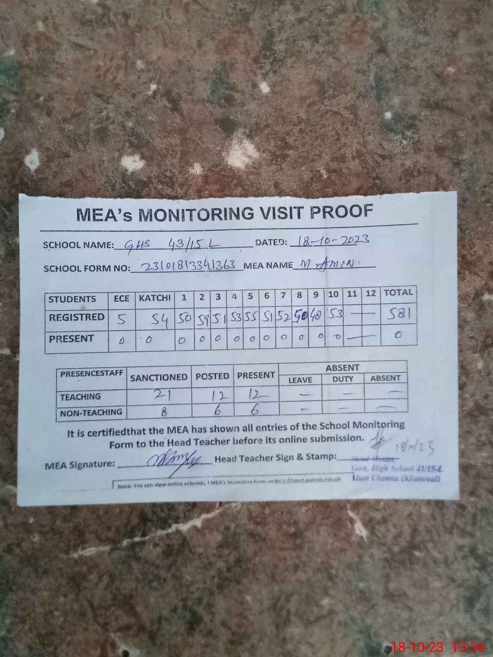 | Attendance Register | Head Teacher | MEA with School | Visit Proof |