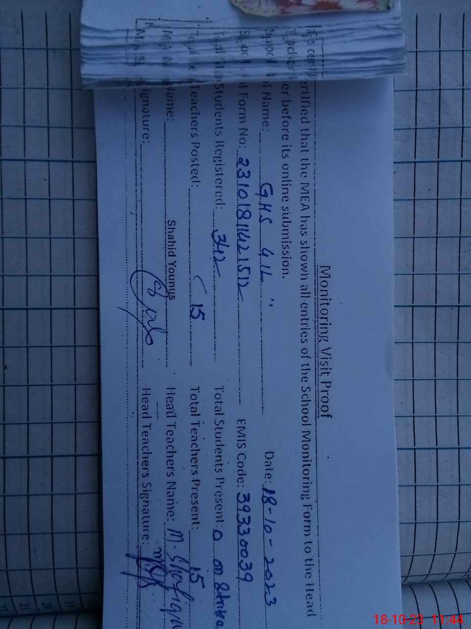 | Attendance Register | Head Teacher | MEA with School | Visit Proof |