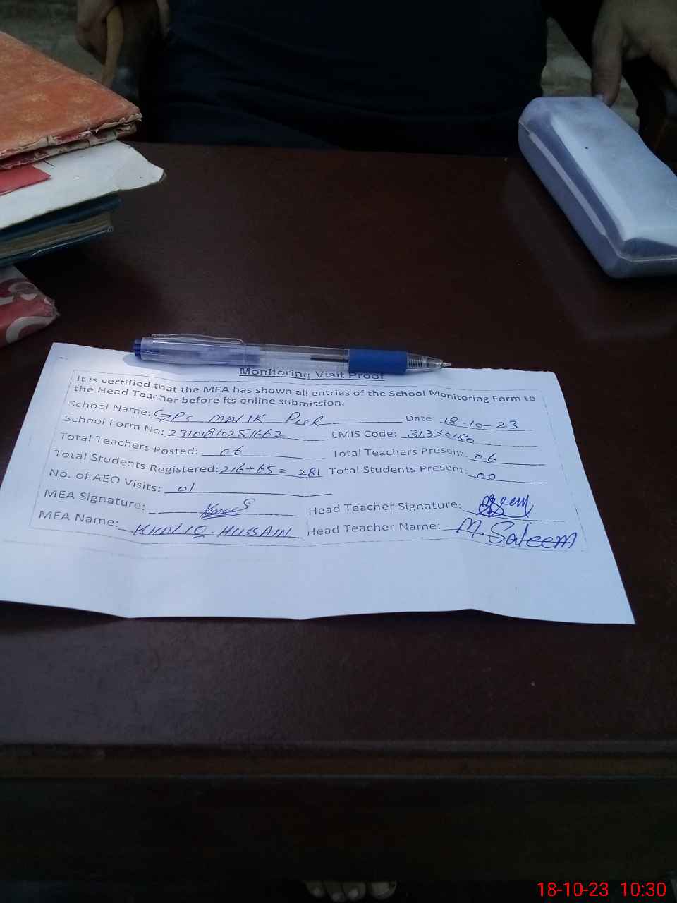 | Attendance Register | Head Teacher | MEA with School | Visit Proof |