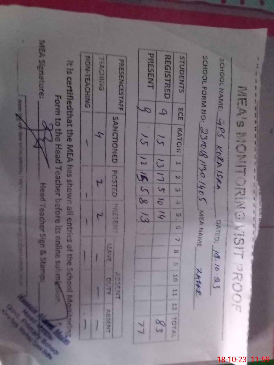 | Attendance Register | Head Teacher | MEA with School | Visit Proof |