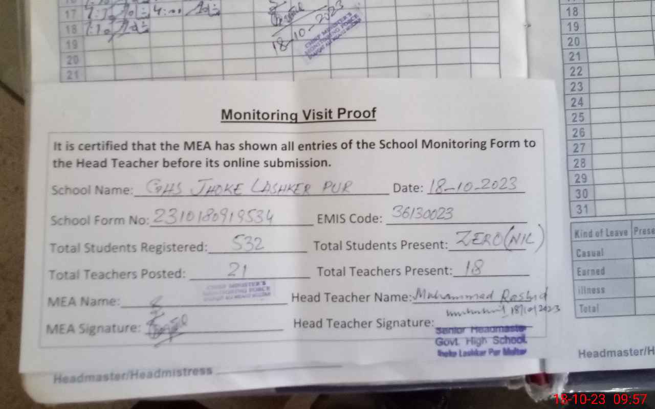 | EMIS Code: 36130023 | Name of School: GHS JHOKE LASHKAR PUR MULTAN | |||