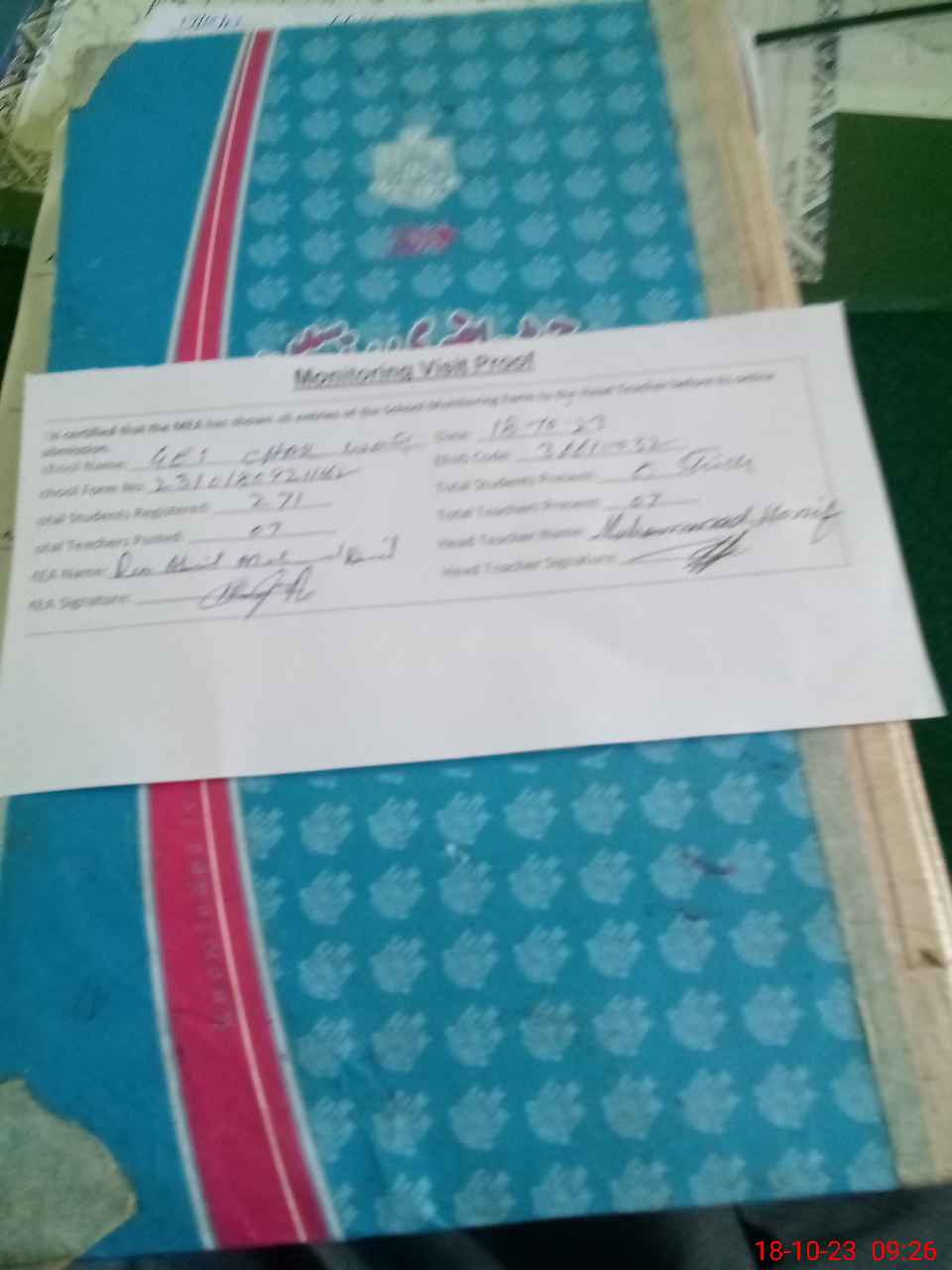 | Attendance Register | Head Teacher | MEA with School | Visit Proof |