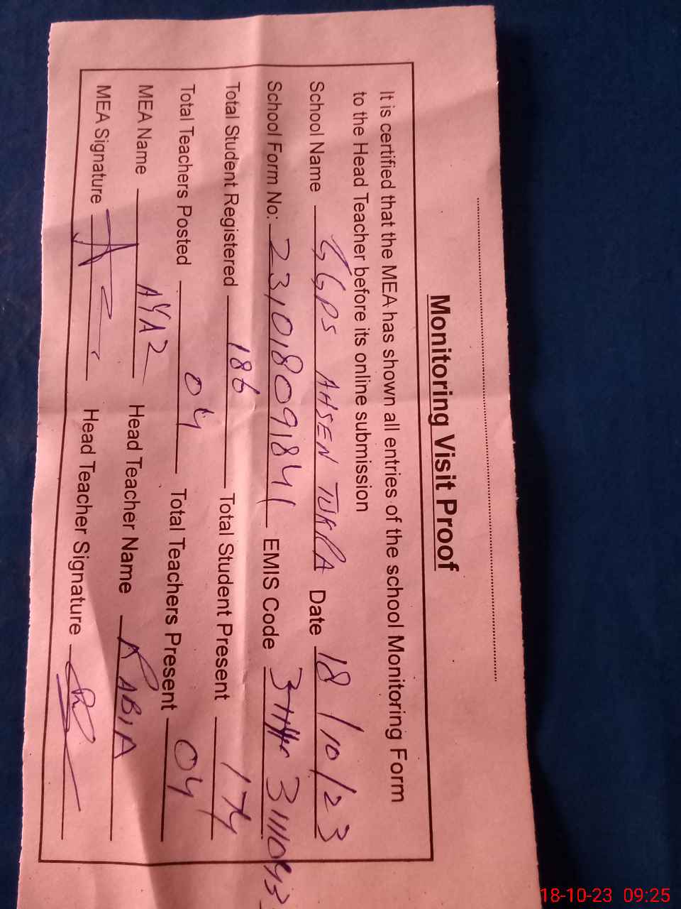 | Attendance Register | Head Teacher | MEA with School | Visit Proof |