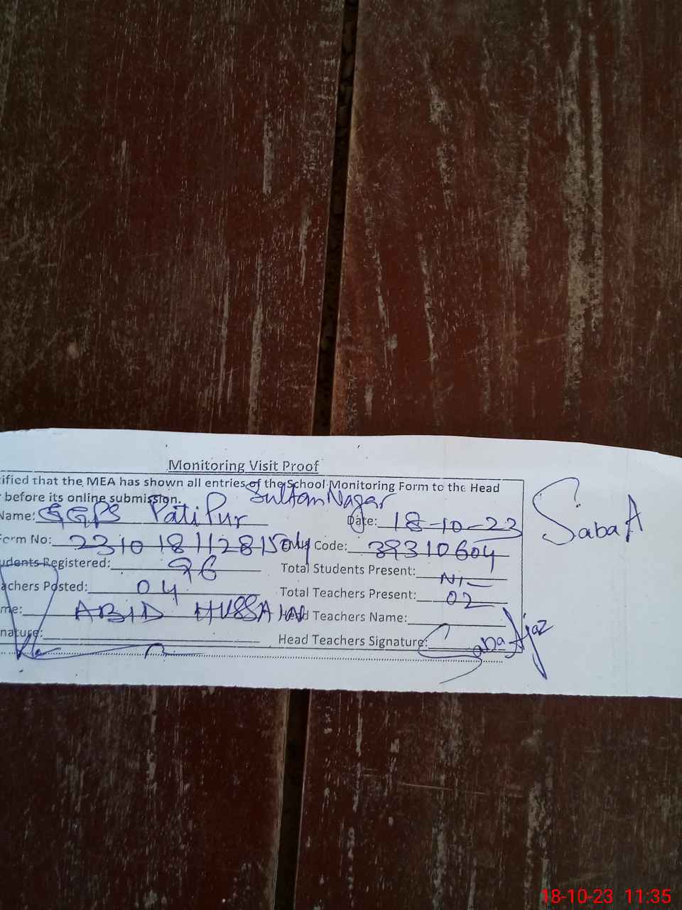 | EMIS Code: 39310604 | Name of School: GGPS PATI PUR (SULTAN NAGAR) | |||