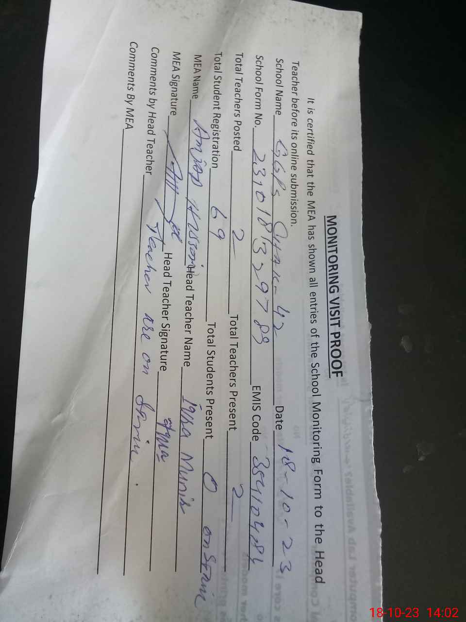 | Attendance Register | Head Teacher | MEA with School | Visit Proof |