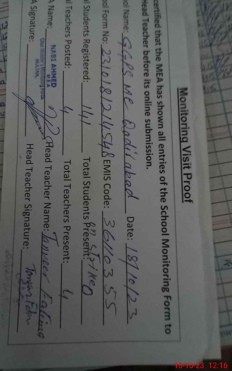 | EMIS Code: 36110355 | Name of School: GGPS MC QADEER ABAD MULTAN | |||