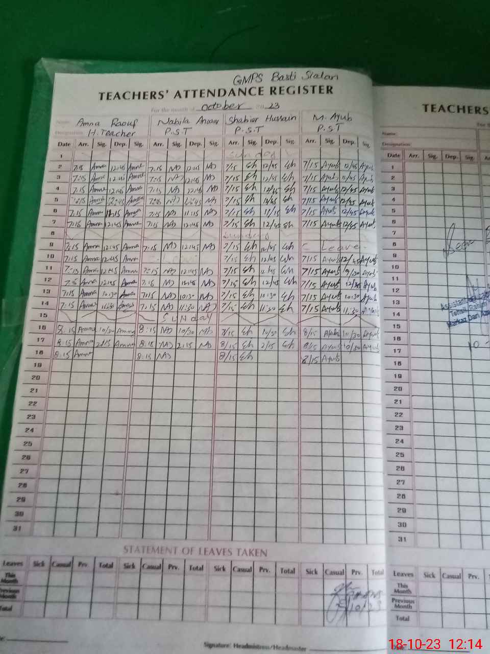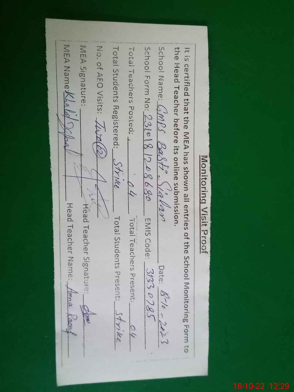 | Attendance Register | Head Teacher | MEA with School | Visit Proof |