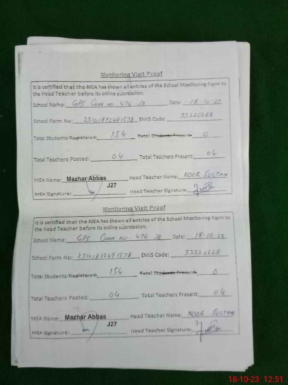 | EMIS Code: 33220268 | Name of School: GPS CHAK NO 476 JB | |||