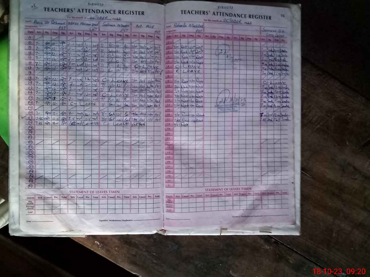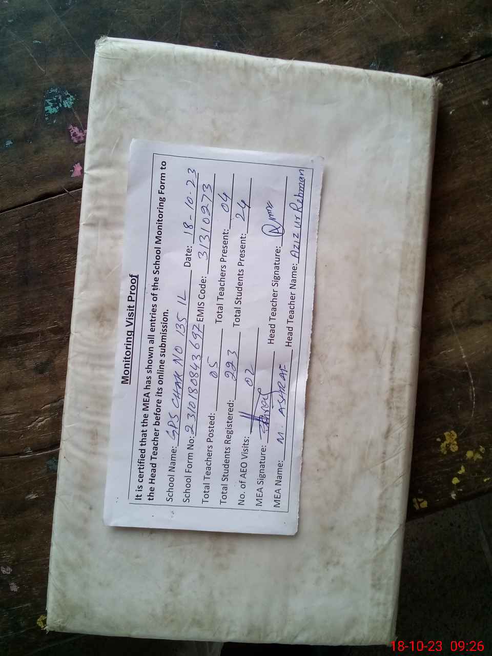 | Attendance Register | Head Teacher | MEA with School | Visit Proof |