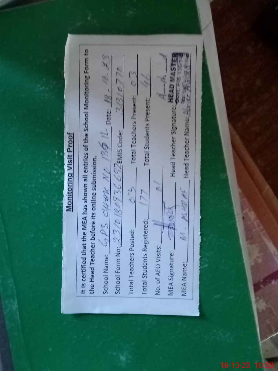 | Attendance Register | Head Teacher | MEA with School | Visit Proof |