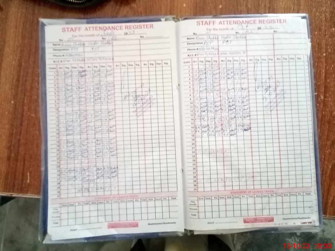 | CNIC | Full Name | Designation | R/C | Absence During Last Calender Month |