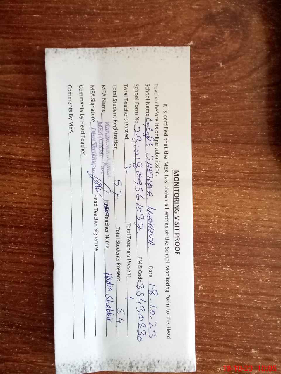 | Attendance Register | Head Teacher | MEA with School | Visit Proof |