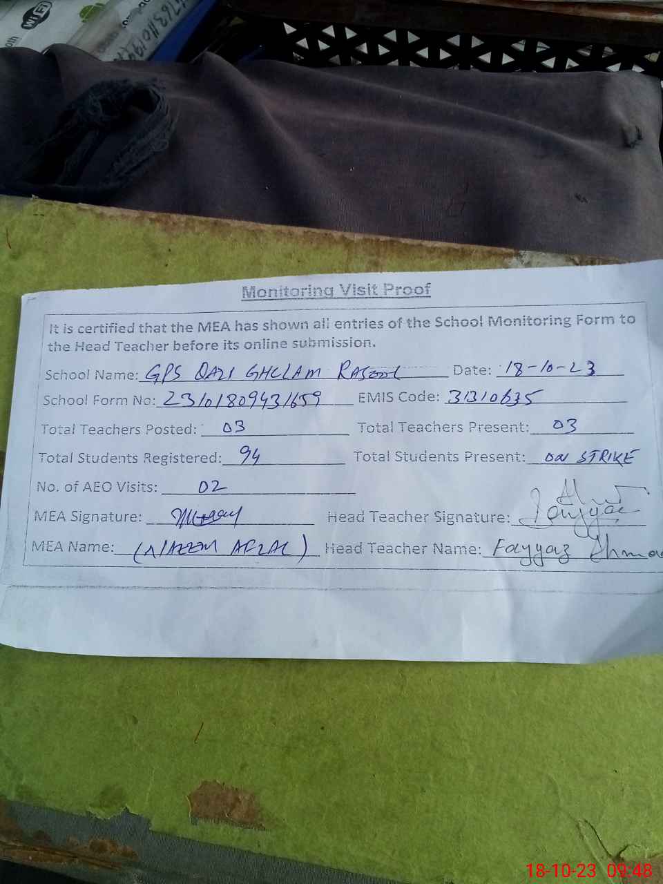 | EMIS Code: 31310635 | Name of School: GPS QAZI GHULAM RASOOL | |||