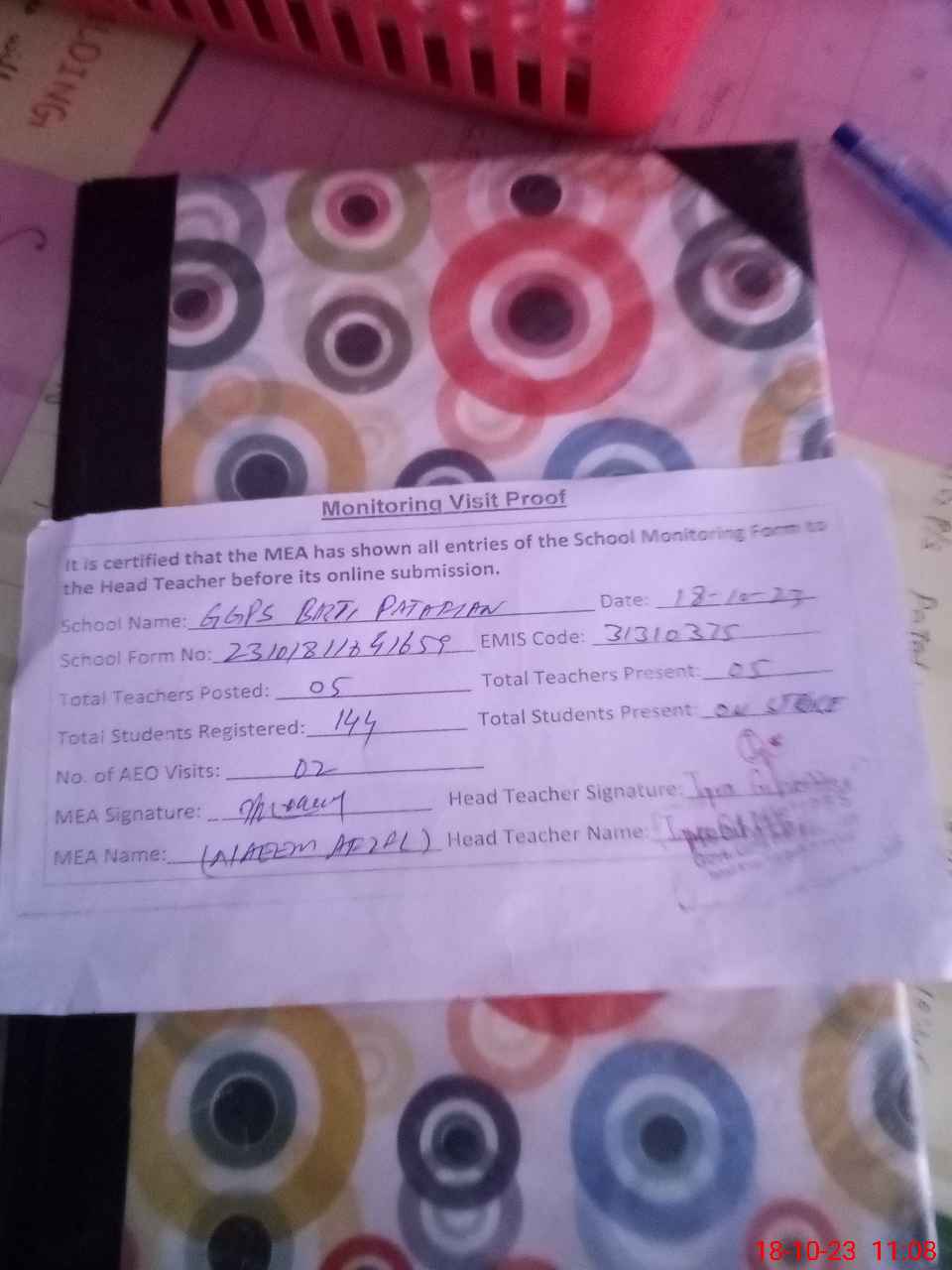 | Attendance Register | Head Teacher | MEA with School | Visit Proof |