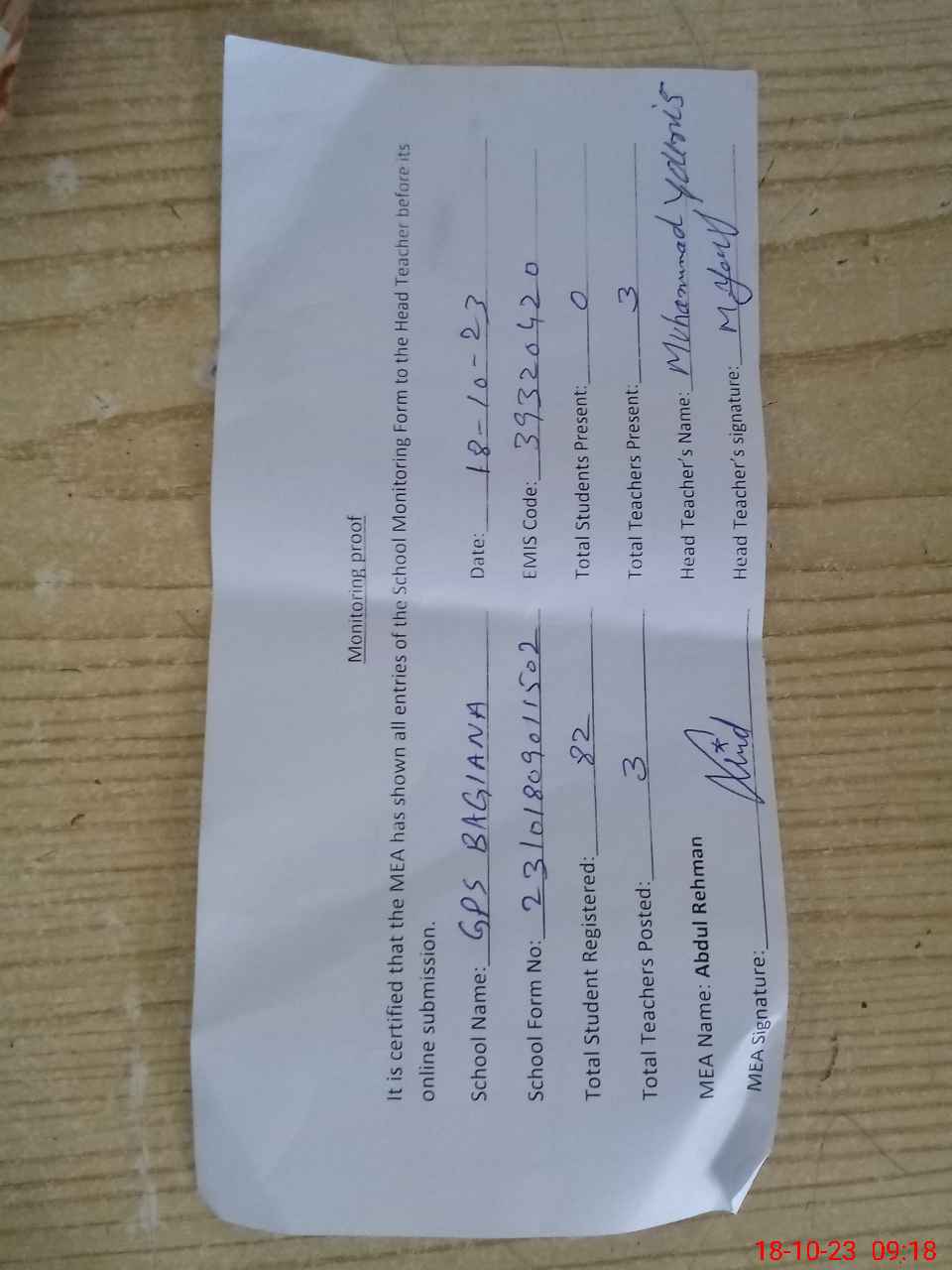 | Attendance Register | Head Teacher | MEA with School | Visit Proof |