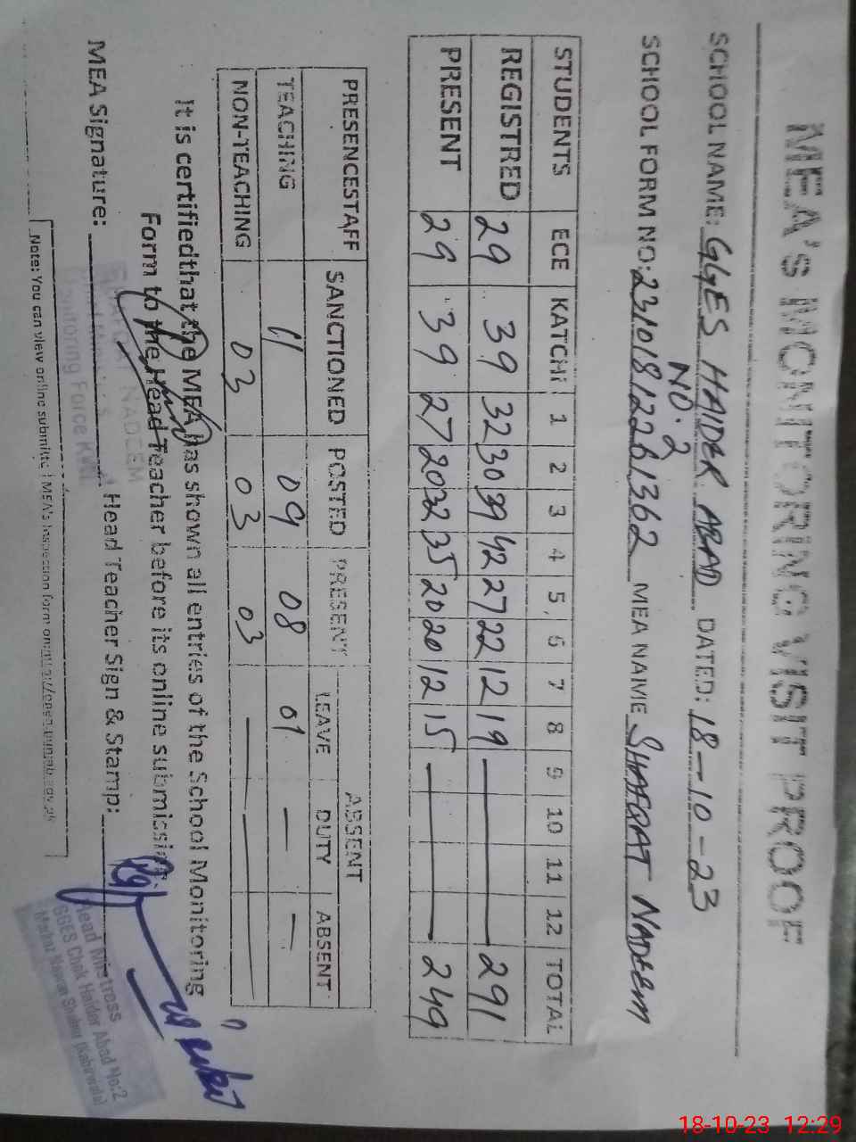 | Attendance Register | Head Teacher | MEA with School | Visit Proof |