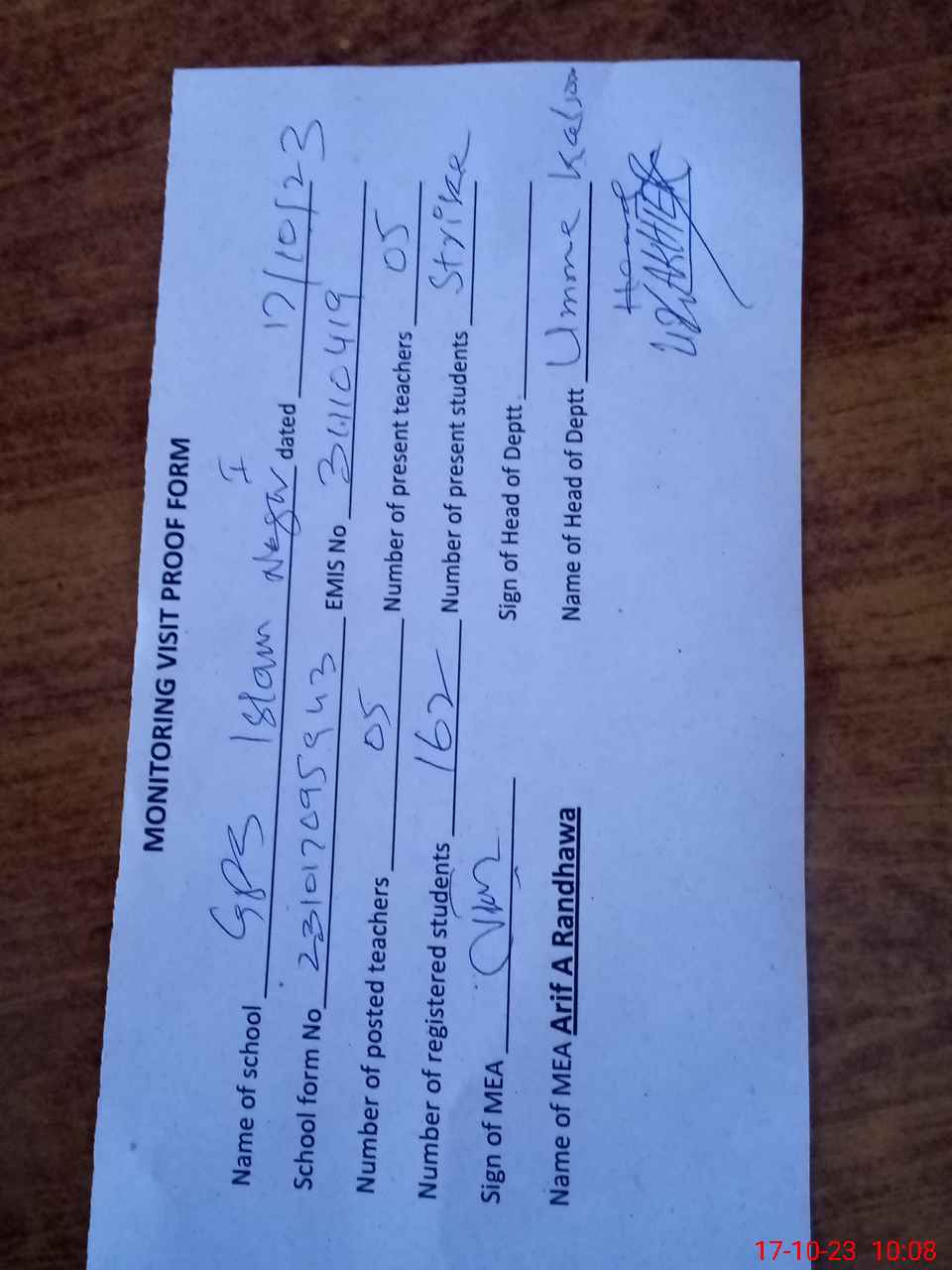 | EMIS Code: 31110419 | Name of School: GGPS ISLAM NAGAR NO. 1 | |||