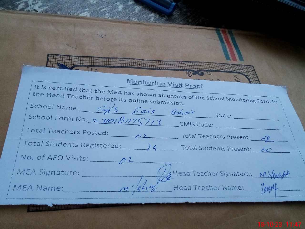| Attendance Register | Head Teacher | MEA with School | Visit Proof |