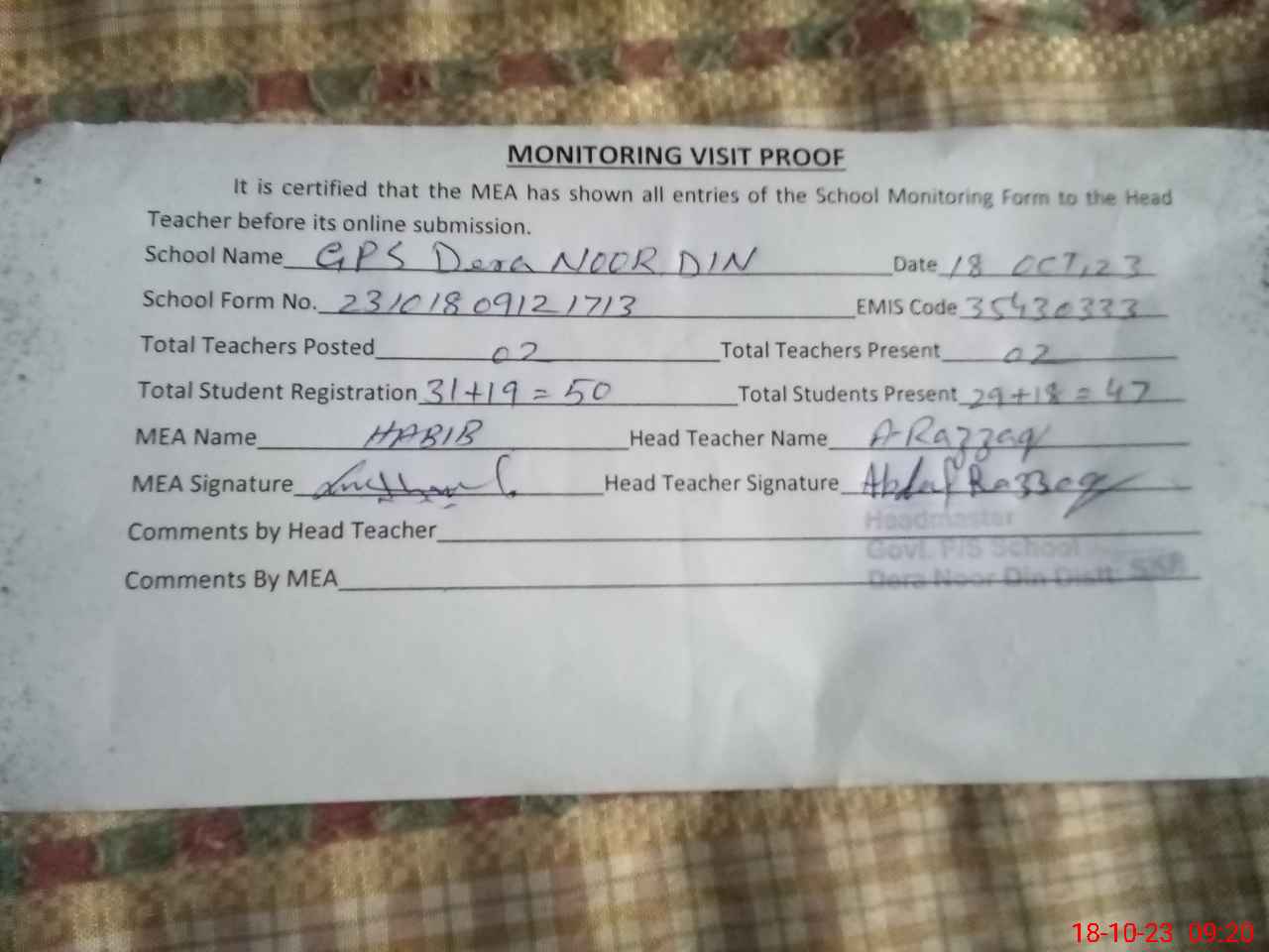 | Attendance Register | Head Teacher | MEA with School | Visit Proof |